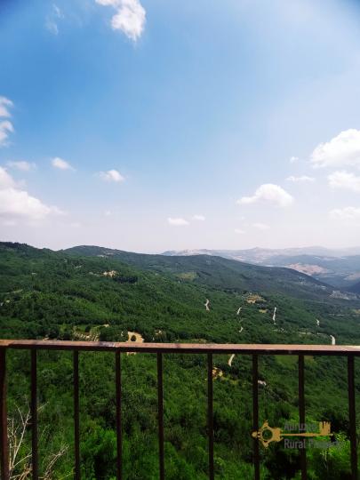 The entrance opens into a long corridor that leads to the kitchen with fireplace and panoramic balcony with view across the hills and the countryside.