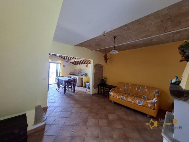 The house stands on four levels, the main entrance, on the second floor opens into a living room with a beautiful, original fireplace, vaulted ceilings, exposed bricks and stone. The adjacent kitchen avails of a fully equipped built-in kitchen and a french balcony with a stunning view of the town and surrounding hills. The ceilings feature original wooden beams. On the same floor there is also a full bathroom with shower facility and a ceiling with wooden beams.