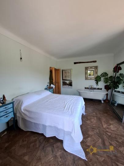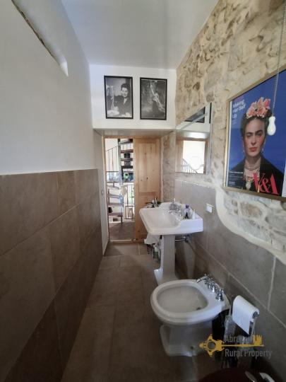 A wooden staircase takes us upstairs where we find a landing with beautiful wooden flooring, that connects the rooms of the sleeping area. On this floor we find a single bedroom with a french balcony and original vintage tiles. Proceeding we find the master bedroom with an en-suite bathtub, a window and a french balcony. Completes this floor a full bathroom with shower and exposed stone.