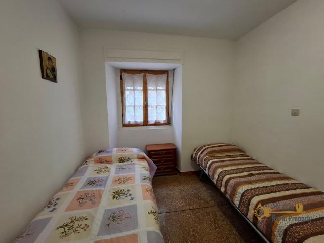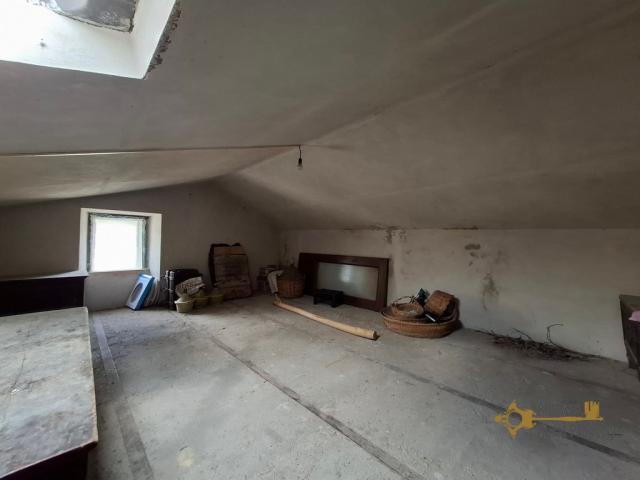 The main entrance is on the ground floor and opens into a kitchen with fireplace. Adjacent to it, and separated by a partition wall, there is a room currently used as a bedroom, which could easily serve as a living room. This space is accessed via a small anteroom with a wardrobe, also divided by a partition wall. As these internal walls are non-load bearing, the layout offers excellent potential to be reconfigured into a spacious open-plan kitchen and living area. A small toilet is also located on this floor.